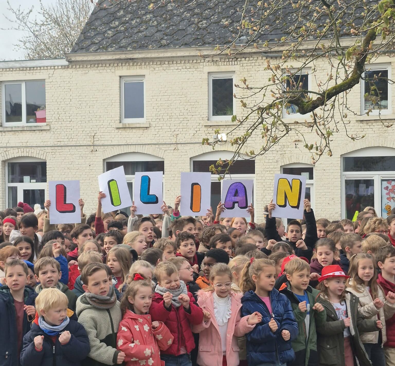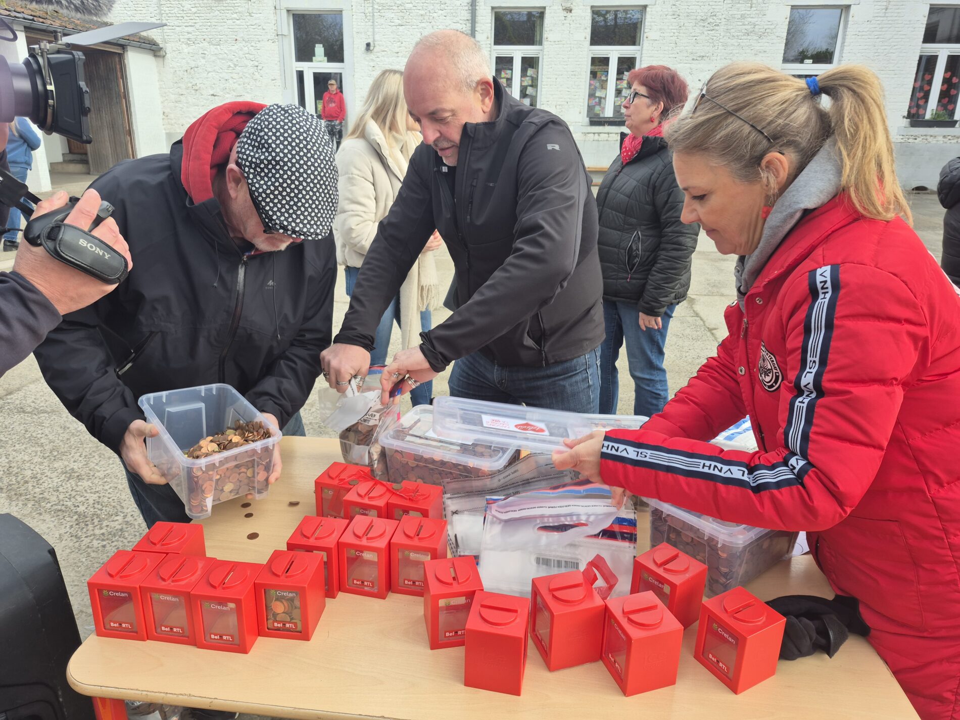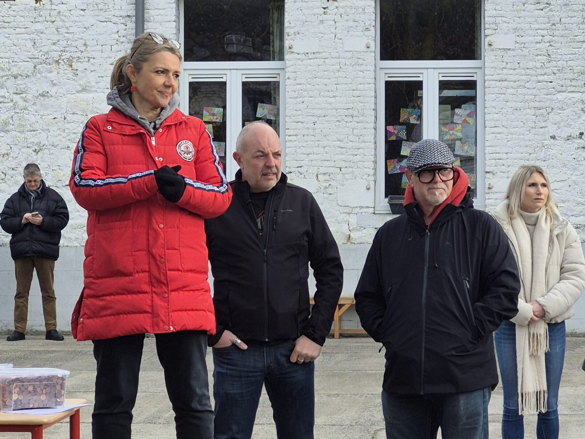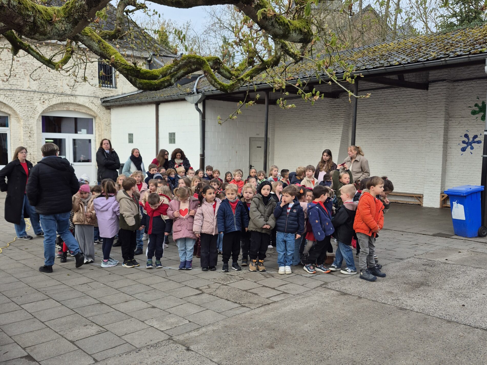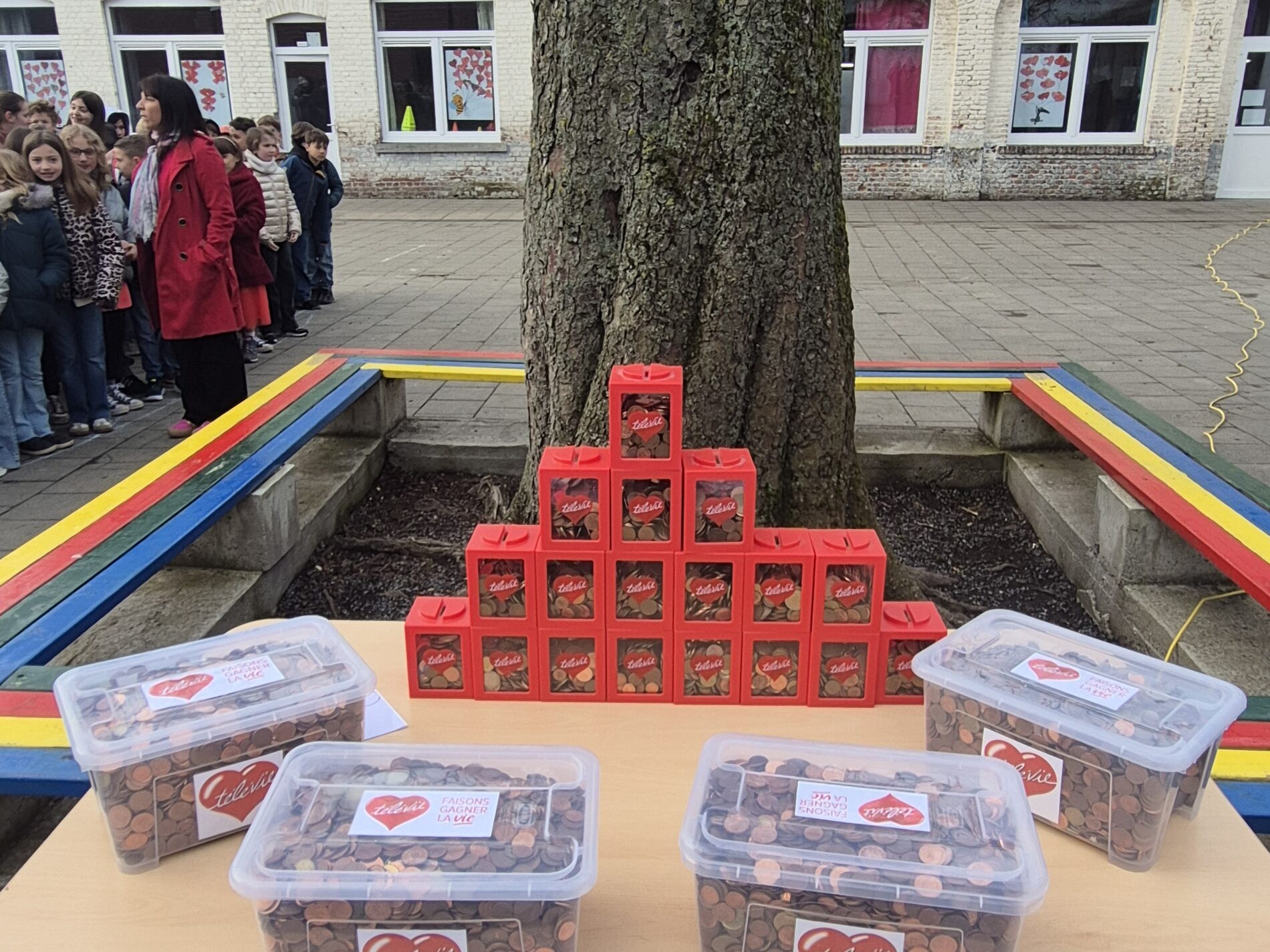 Ce mardi 31 mars, Bérénice et Léon accompagnés de Bertrand Caroy sont venus dans notre école pour récupérer les pièces rouges que nous avions récoltées au profit du Télévie.
